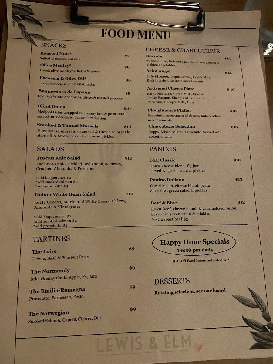 Welcome to Lewis and Elm, a charming wine bar nestled at 600 S Elm St, Greensboro, NC. This chic establishment sets the stage for a delightful evening with its stylish decor and cozy ambiance. The menu boasts an impressive selection of small bites, perfect for pairing with their carefully curated wine list.